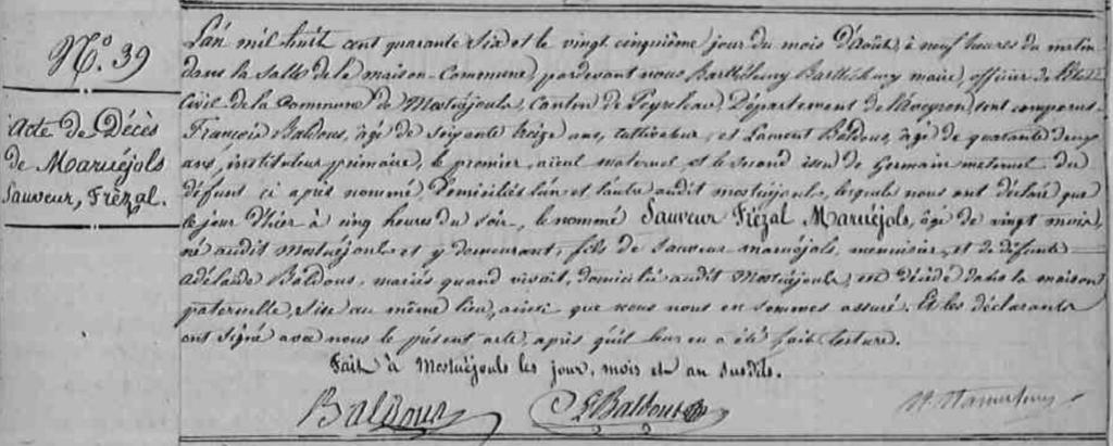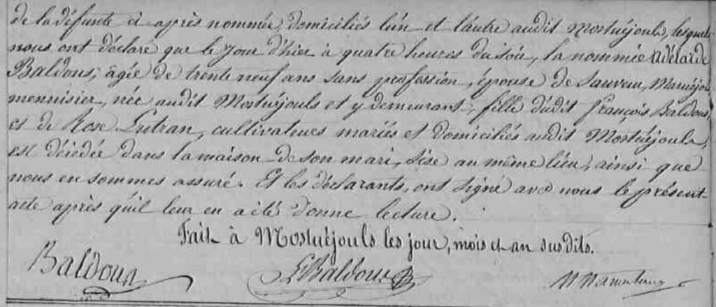 Les BALDOUS qui n’avaient pas beaucoup de terres à cultiver ont choisi de faire de la lecture et de l’écriture, un métier. Ils sont devenus Instituteurs et, avant l’heure, secrétaires de Mairie. Ils ont tenu les registres de l’État Civil de Mostuéjouls pendant plus d’un demi-siècle, de la Révolution française jusqu’au milieu du 19ème siècle.