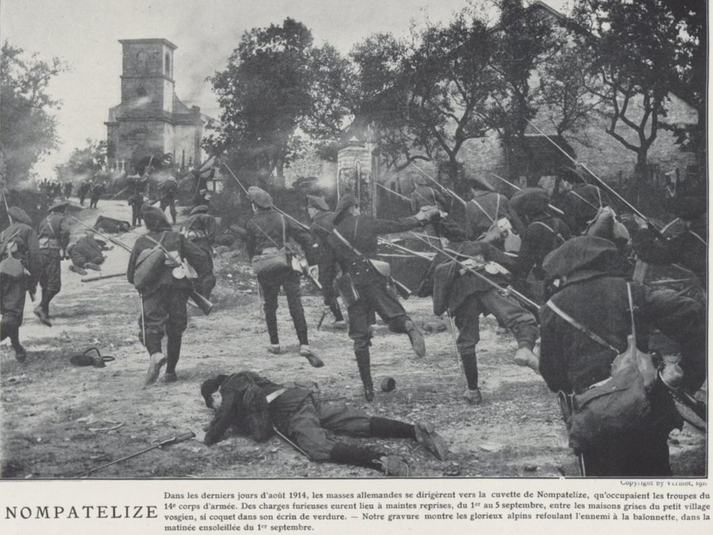 Les Chasseurs à pied, leur béret sur la tête, sans casque, sans aucune protection, à l’assaut baïonnette au canon, totalement à découvert … Une photo saisissante prise le 1er septembre 1914 à Nompatelize à la mort d’Ernest. Des garçons, pour ne pas dire des enfants, dans la fougue de la jeunesse, comme des écoliers, ou presque, courant vers la mort. L’horreur.