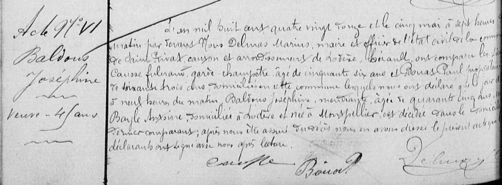 Trois ans après son second mariage, Joséphine reste veuve à nouveau. Son mari Antoine Bayle décède le 10 octobre 1891 à Lodève à l’âge de 63 ans. De cultivateur, il est inscrit à l’état civil comme chiffonnier. Mais le pire est à venir. Joséphine meurt sept mois plus tard le 05 mai 1892 à Saint-Privat près de Lodève. L’acte de décès la désigne comme « Mendiante ». Elle a 45 ans. Comment est-elle morte ? Si l’on se réfère à son acte de décès, l’un des deux déclarants semble dire qu’elle est morte dans sa maison à quelques kilomètres de Lodève. Elle est morte certainement à bout de forces, de faim, de soif, de froid, de misère, de solitude, peut-être d’alcoolisme ou de tuberculose, ou d’autre chose encore, d’une maladie infectieuse par exemple. Comment savoir ? Elle est morte seule, sans enfant, sans famille et sans ses parents. Son père Jean-Pierre Baldous décède le mois suivant le 26 juin 1892, à l’Asile des petites soeurs des pauvres à Montpellier à l’âge de 79 ans. Sa mère décèdera 4 ans plus tard à l’Hôpital général de Montpellier à l’âge de 76 ans. Et c’est ainsi que se termine l’histoire de Joséphine Baldous et de cette branche familiale.
