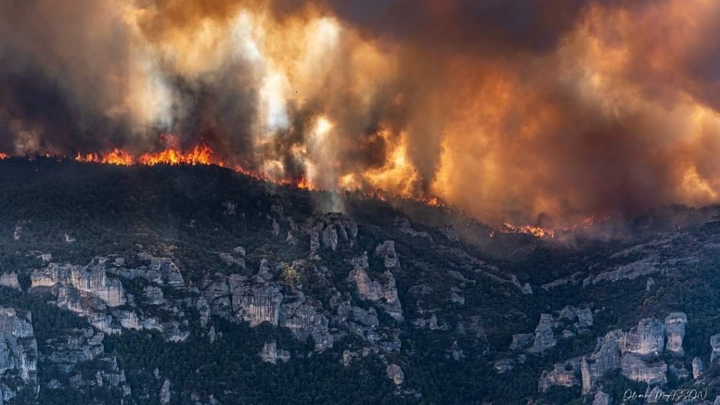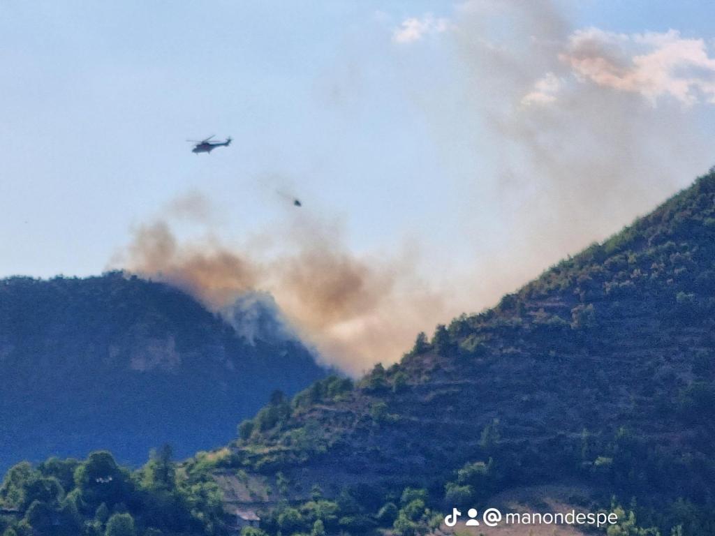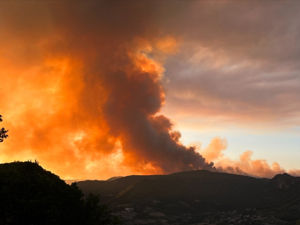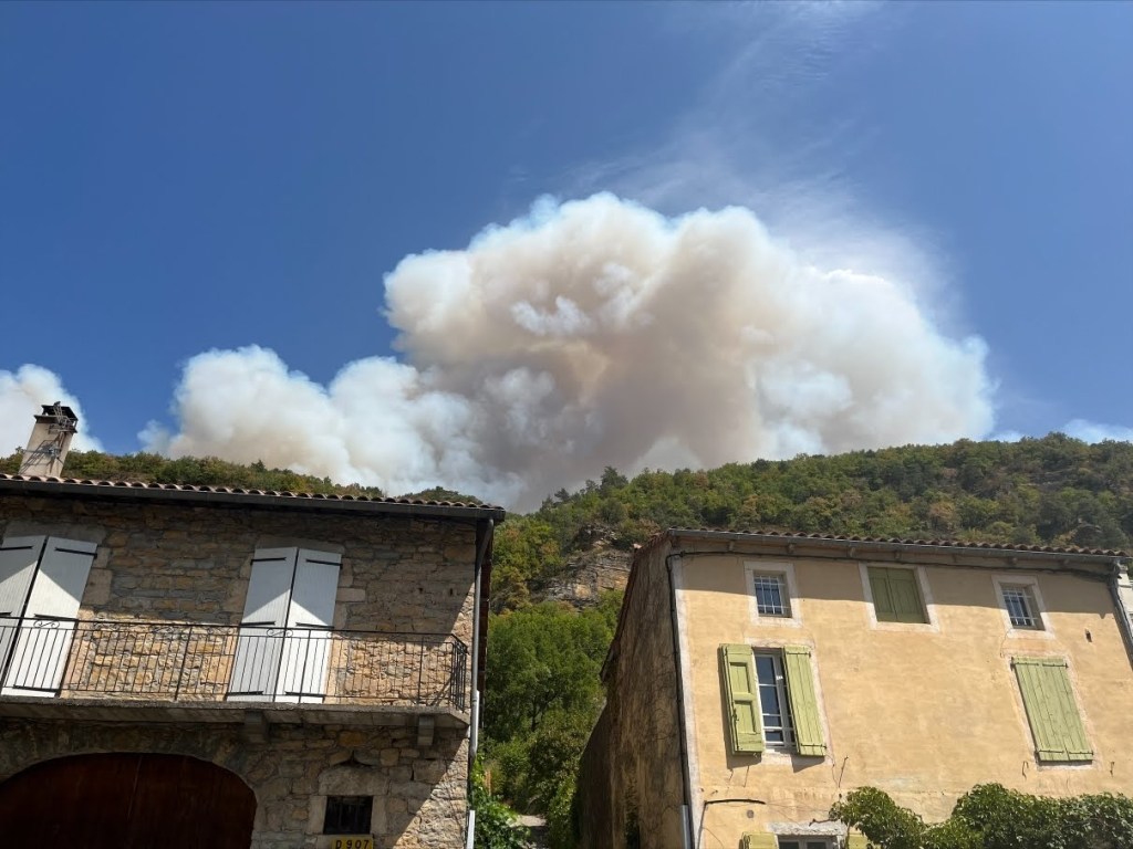 Un adage dit qu’il ne faut pas réveiller le chat qui dort. En effet, dans la nuit alors que tout paraissait calme, le vent a tourné et a réveillé le feu qui a repris de plus belle. Poussée vers l’Est cette fois-ci, les flammes sont parties dans la direction de Bellevieille et du Vors dont les bâtiments n’ont pas subi de dommages. Mais surtout le feu s’est engouffré dans le ravin du Rio des Arziolles ravageant les deux flancs de la vallée, à l’ouest la vieille route du Massegros jusqu’aux abords de Mostuéjouls et sur l’autre versant poussé par un vent furieux alimenté par la chaleur de l’incendie, le feu dévalait dangereusement en direction de Comayras et embrasait les falaises avant Liaucous. Un énorme panache de fumée s’est formé en direction du Rozier. Dans l’urgence et face à un incendie qui prenait les caractères d’un feu incontrôlable, les habitants de Mostuéjouls, Comayras, Liaucous, Saint-Pal, la Muse ainsi que les campings ont été évacués par la Gendarmerie dans l’après-midi du samedi 13. À nouveau avec l’aide d’amis et de membres du Conseil municipal et malgré la fatigue, nous sommes repartis à Millau comme nous étions venus, chez nos hôtes dont la fatigue était largement égale à la nôtre sinon plus.