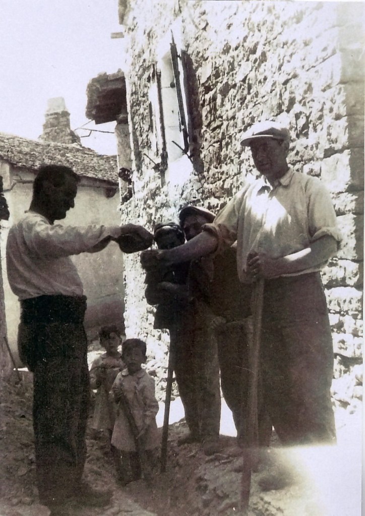 Les photos ci-jointes sont de précieux témoins de cette aventure. Elles ont été prises au niveau de la maison BALDOUS et de la cave de la maison PRIVAT. Ces images rappelleront aux plus anciens d’émouvants souvenirs. Sur l’une d’elles, on voit au premier plan celui dont j’ai oublié le prénom mais que l’on appelait familièrement dans le village « PRIVADOU » (le père de Charles PRIVAT). Il sert un verre à Edmond BAUDOUNET, le facteur. Derrière, on reconnaîtra, sur les deux photos, Jean MANENC (le père de Claude) et Fernand HÉRAN, jeune, qui deviendra un peu plus tard le mari de Jeanne HÉRAN. Dans le fond, on notera un groupe de trois femmes : à gauche Fernande DUMAS, au milieu madame LAVABRE (la grand-mère de Claude MANENC) que l’on peut voir aussi penchée à sa terrasse sur l’autre cliché, à droite Marie BAUDOUNET, la femme d’Edmond. Enfin, il y a aussi deux enfants, Philippe BALDOUS, sept ans, et son frère Alexis, cinq ans, mais dont on devine qu’ils n’étaient évidemment là que pour la photo …