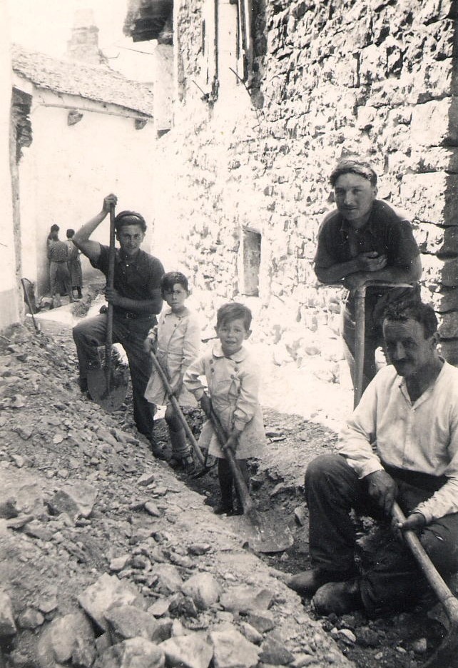 La décision fut donc prise et les travaux commencèrent. Il fallut éventrer les rues du village. À la pioche ! Pas de tractopelle à l’époque. Il fallut recruter des volontaires. Rappelons que les hommes jeunes étaient pour la plupart (près d’une dizaine) prisonniers en Allemagne. Le premier tronçon partait de la fontaine en direction de la Placette et suivait donc la rue qui porte aujourd’hui le nom de « rue de la fontaine ».