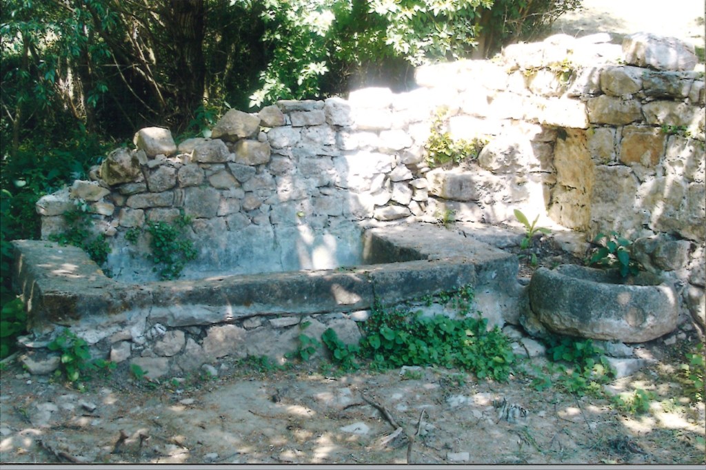 Pourtant, à l’origine, cette fontaine avait eu sa raison d’être et son histoire. A vrai dire, son architecture fait plutôt penser à un bassin ou à un lavoir, de forme rectangulaire, rustique, fait de grosses pierres taillées. Sa seule fantaisie tient à la présence, sur sa droite, d’une vasque arrondie en pierre qui collectait l’eau de la source et la reversait ensuite dans le lavoir. Dans le mur situé au Nord, a été creusée une niche destinée sans doute à recevoir une sculpture. Une statuette peut-être. Mais nul n’a le souvenir que cette fontaine ait jamais été le lieu d’une quelconque dévotion. Depuis longtemps cette niche est vide. Plus à droite, se trouve une autre niche murale en angle avec une pierre plate qui aurait pu servir de siège ou de rebord pour poser quelque chose.