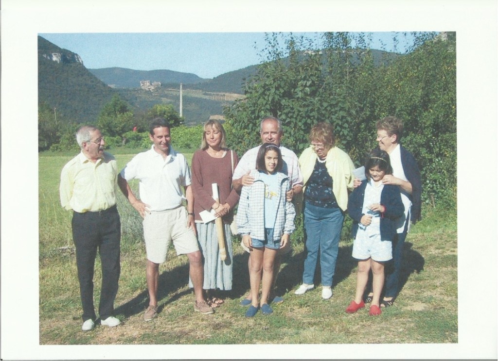 A la Peyrouse à Mostuéjouls en août 2001, de gauche à droite : Philippe, Jean-Jacques et Dominique son épouse, Alexis, Madeleine épouse de Philippe et Madeleine épouse d’Alexis. Au 1er rang, Ana et Julia, petites-filles d’Alexis et Madeleine