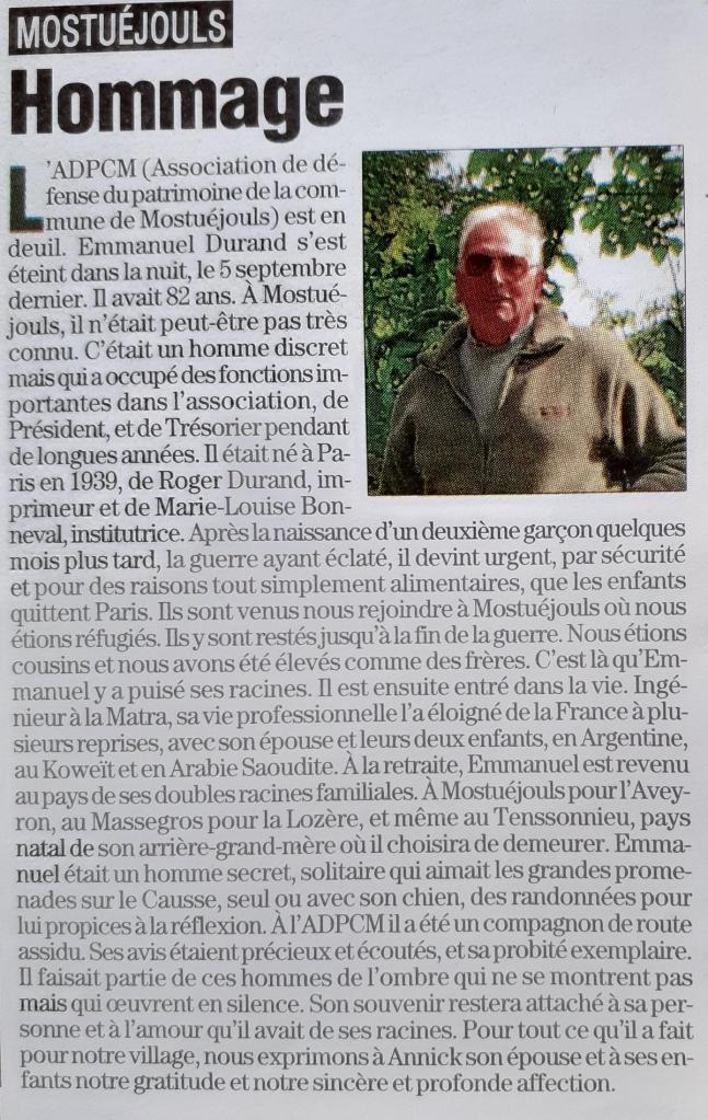 à la création de l’ADPCM, l’Association de Défense de notre patrimoine. Il en a été un des pionniers. A tous ceux que j’ai déjà cités, comment ne pas ajouter, Roland et Claudette, Jean-Paul et Catherine, Emmanuel Durand et Annick, les Costes de Liaucous, Roger récemment disparu. J’en oublie, et je m’en excuse …