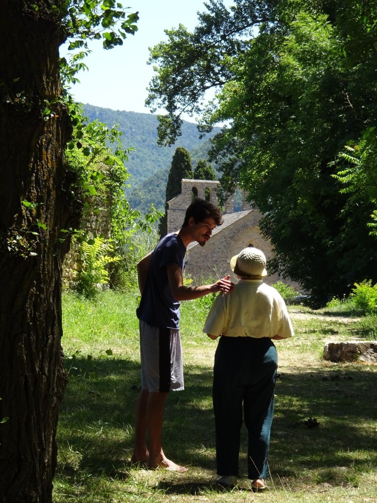 C’était au début de notre séjour à Mostuéjouls en 2020. L’après-midi, je descendais avec Madeleine au camping de l’Aubigue, au bord du Tarn. C’était un terrain plat, ombragé, agréable pour la promenade. Nous pouvions en disposer grâce à la gentillesse de Jean-Louis Valentin et nous y étions souvent accueillis par Marie-Hélène Portalier qui aimait voir Madeleine s’y promener malgré son handicap et faire des progrès, selon elle. A cette époque, Madeleine marchait encore seule ou à mon bras. Elle jouissait d’une petite autonomie et je lui laissais la liberté de faire quelques pas en la surveillant de près. Elle s’approchait des arbustes pour y prélever deux ou trois feuilles. Elle semblait apaisée et heureuse. Notre vieux couple faisait l’objet d’une attention chaleureuse de la part des touristes français et étrangers qui campaient là et dont beaucoup venaient tous les ans depuis plusieurs années. Il y régnait une sorte de climat familial.